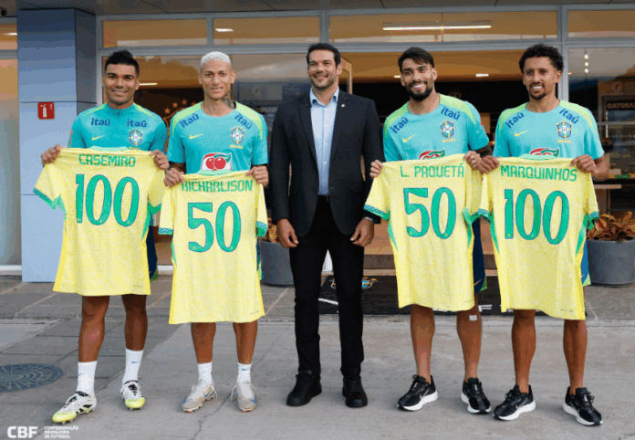 Marquinhos, Casemiro, Lucas Paquetá e Richarlison foram homenageados pela CBF no fim da tarde desta terça-feira (2), pelas marcas de jogos e convocações pela Seleção Brasileira Principal. Eles receberam as camisas comemorativas das mãos do presidente da CBF, Samir Xaud, após treino na Granja Comary, em Teresópolis (RJ).